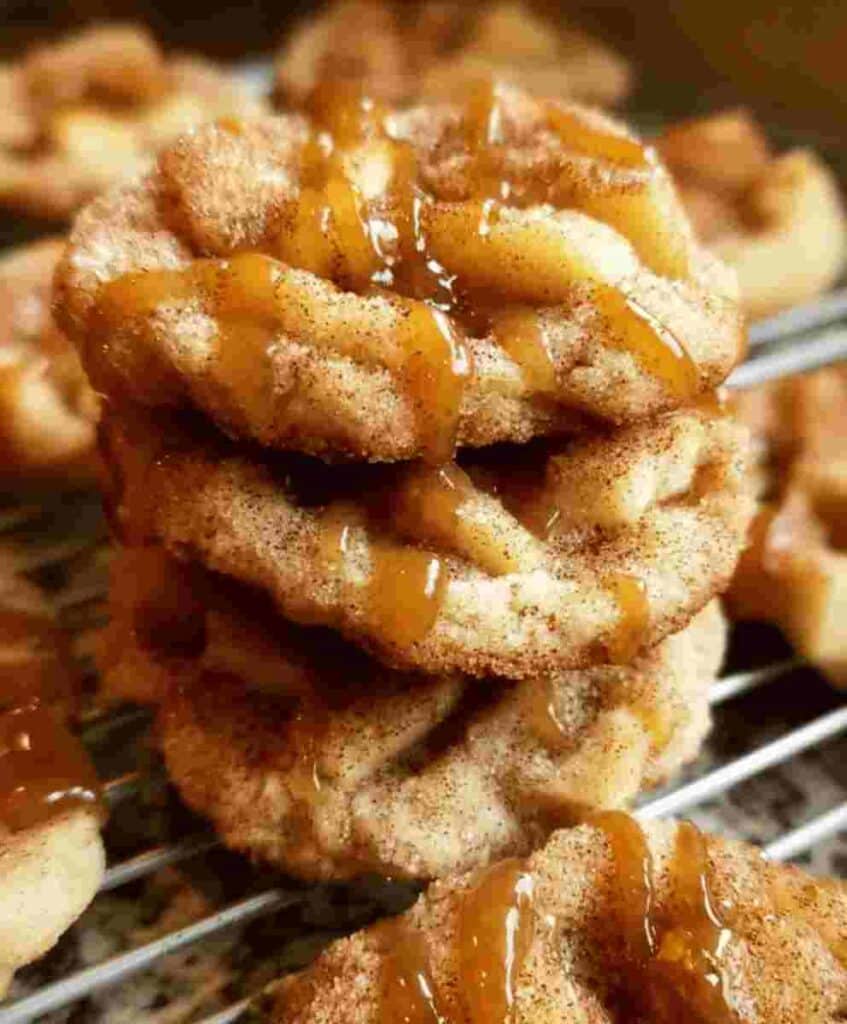- 4. Assemble Cookies: Roll out half the dough on a floured surface to 1/8-inch thickness. Use a cookie cutter to cut out circles. Place a small spoonful of apple filling and caramel sauce in the center of each circle. Fold over to form a half-moon and press edges with a fork to seal.
