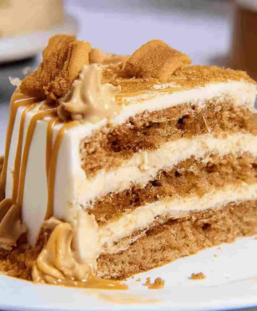 - 7. Frost and Decorate: Apply a crumb coat, chill, then frost the cake fully. Press chopped Biscoff cookies around the sides, pipe a decorative border on top, and finish with a drizzle of warm cookie butter.