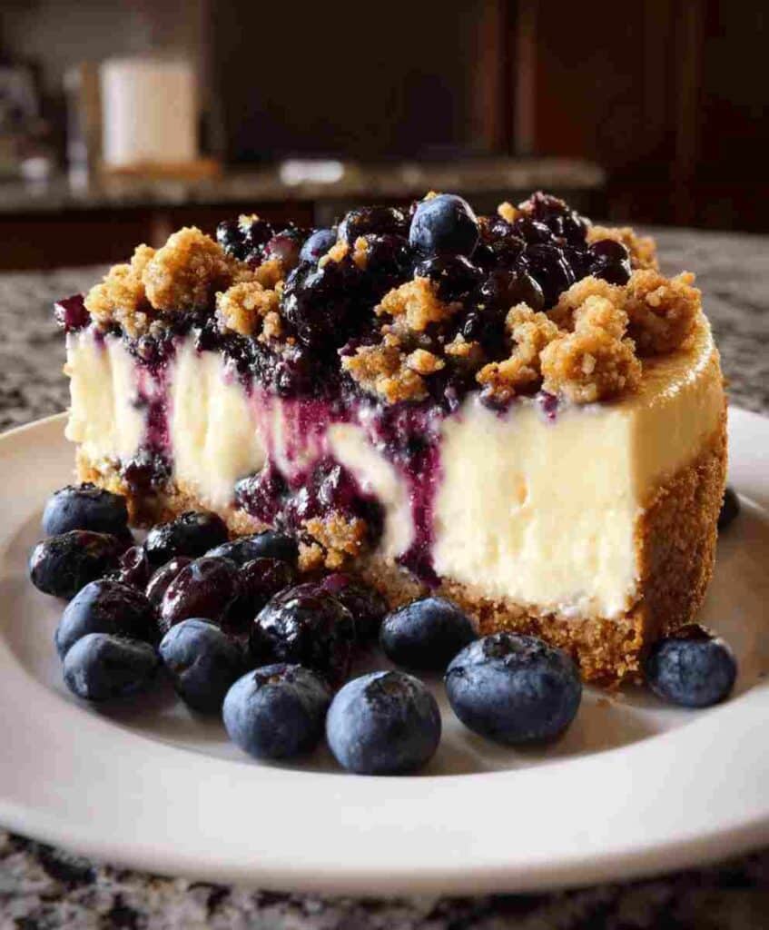 Imagine the scent of buttery crust baking in your kitchen, followed by the irresistible aroma of bubbling blueberries and golden crumble. Each slice offers the perfect harmony of creamy and crunchy textures – an elegant twist on traditional cheesecake that’s as simple as it is spectacular. Whether you’re looking for easy dessert recipes or family comfort food ideas, this cheesecake delivers indulgence without the stress.