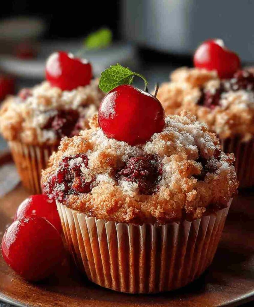 - Assemble the Muffins: Spoon about 2 tablespoons of muffin batter into each liner. Add 2–3 tablespoons of cherry filling on top. Sprinkle evenly with crumble topping.