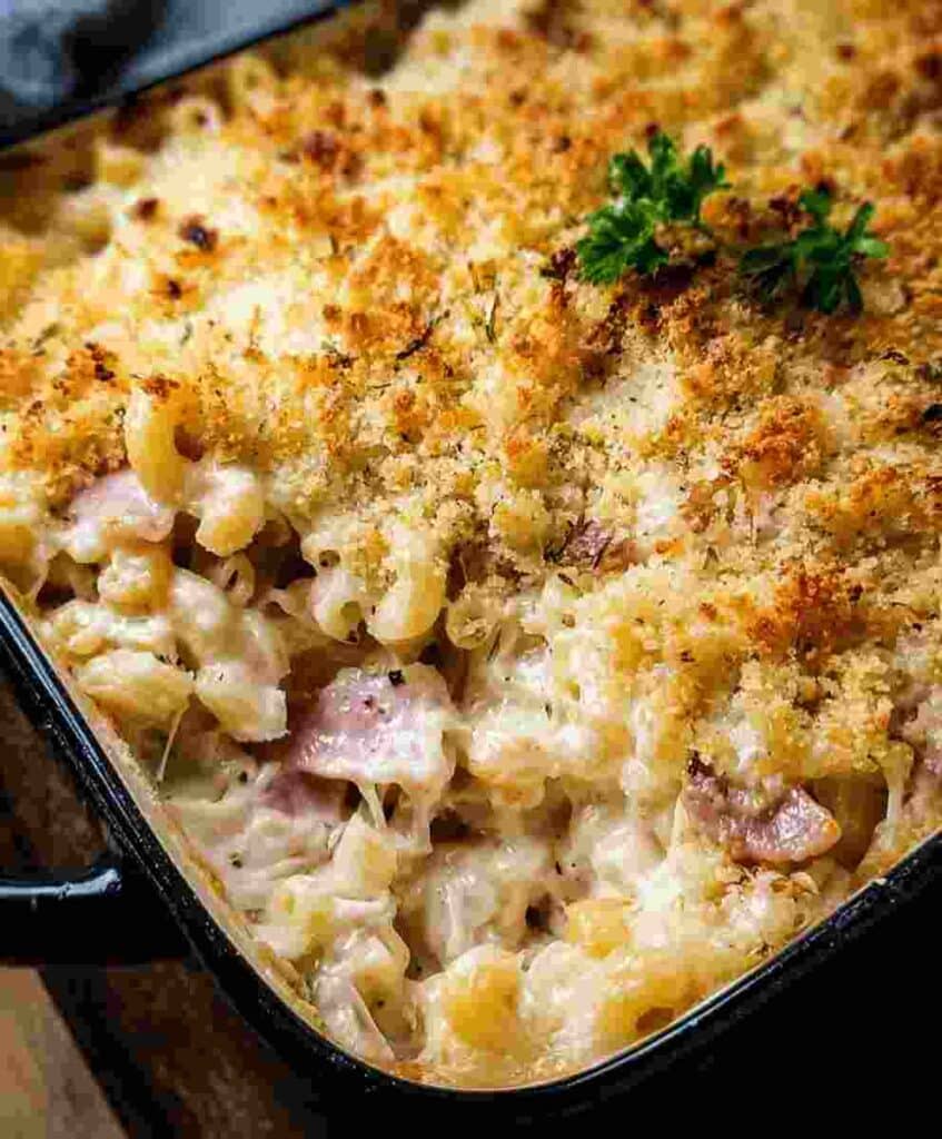 A creamy, cheesy twist on the classic Chicken Cordon Bleu—made easy in comforting casserole form with tender pasta, Swiss cheese, rotisserie chicken, and a golden buttery breadcrumb topping.