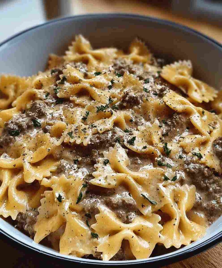 Creamy pasta dishes like this one have deep Italian roots, where Parmesan and garlic are kitchen staples. The combination of butter, cheese, and cream is a hallmark of traditional Italian comfort food, modernized here with a hearty American twist juicy ground beef and bowtie pasta. It’s the perfect fusion of Italian elegance and American family-style cooking, delivering both comfort and convenience in every bite.