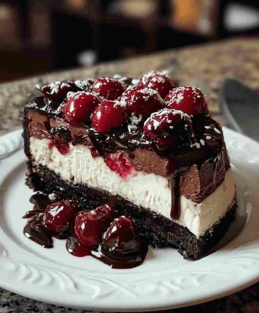 Each bite delivers smooth chocolate decadence balanced by the tart sweetness of cherries and the airy lightness of whipped cream. Whether you’re planning an elegant dinner party, a festive holiday celebration, or simply craving a luxury homemade dessert, this cheesecake is guaranteed to impress. And best of all, it’s easier to make than it looks perfect for home bakers who love simple dessert recipes with a gourmet twist.