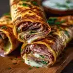 French Dip Tortilla Roll Ups are like a small, hot sandwich rolled in a tortilla. They hold roast beef and melted provolone. You dip them in au jus. They cook fast in a skillet. This makes a tasty and easy meal.