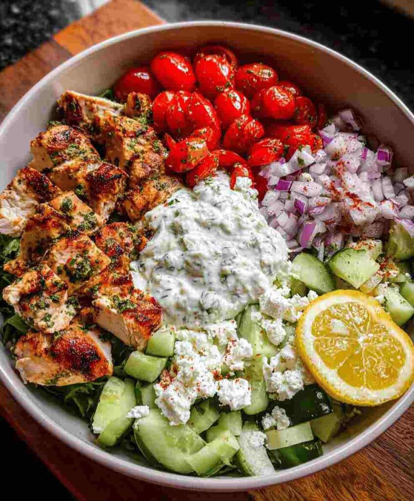 - Assemble the bowls with rice or quinoa, lettuce, vegetables, sliced chicken, feta cheese, and a generous spoonful of tzatziki.