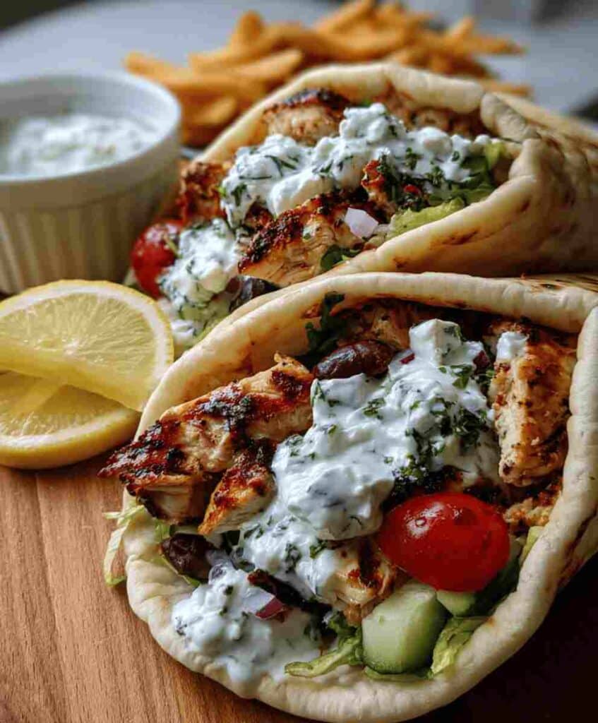 Use chicken thighs for maximum flavor they stay moist and juicy. Marinate overnight for deeper flavor. Warm the pita before serving to make it soft and pliable. Chill the tzatziki for 30 minutes to enhance flavor. If you have a grill, use it to add authentic char and smokiness.
