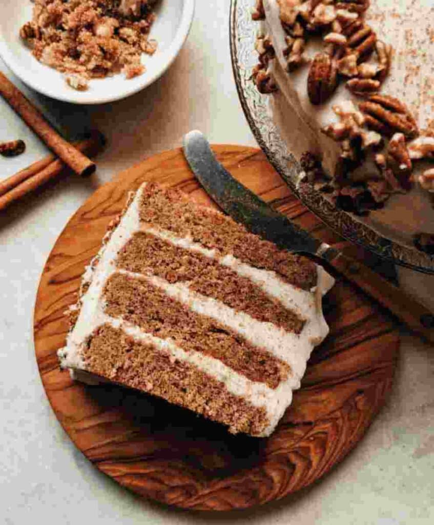 Apply the remaining frosting evenly over the cake. Decorate with cinnamon sticks, candied nuts, or crumbled cake pieces. Chill until ready to serve.