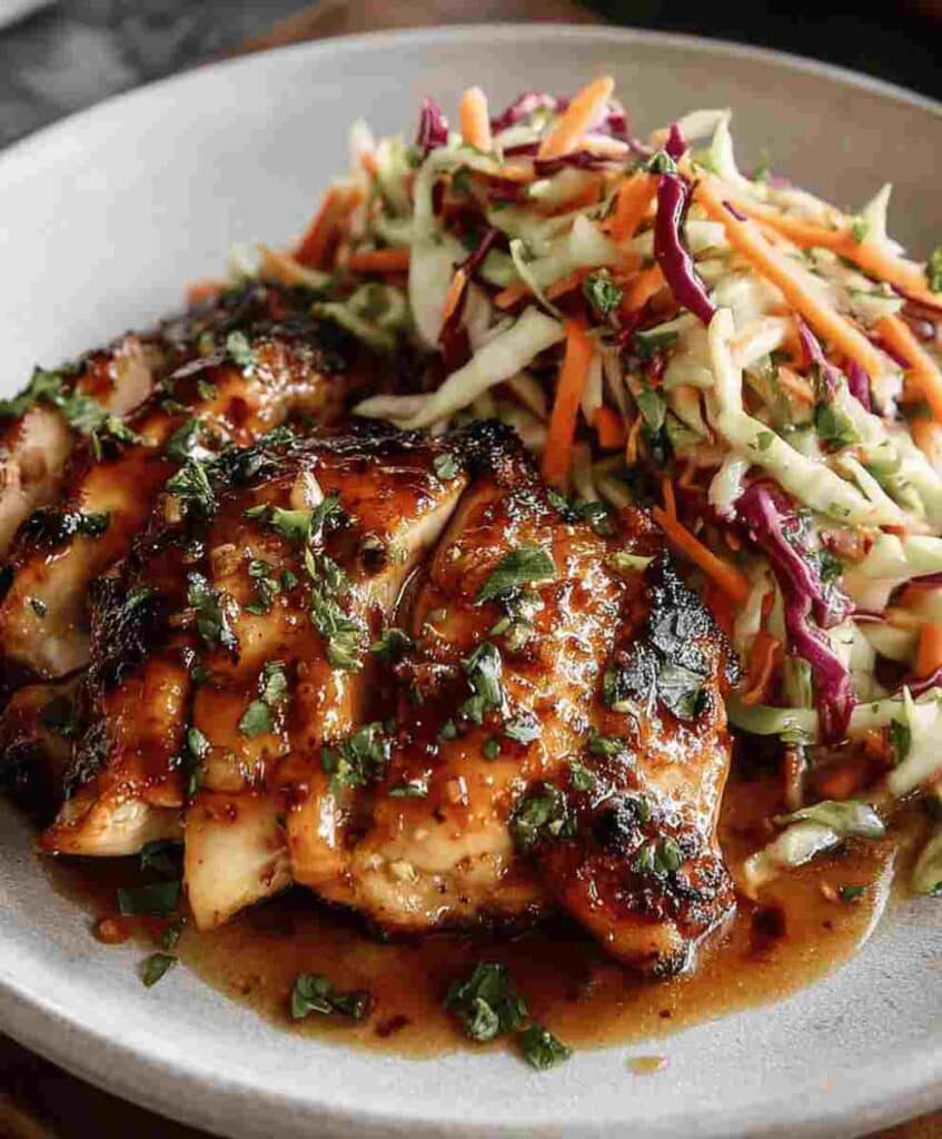If you’re craving an easy dinner recipe that delivers incredible flavor without complicated steps, this Sticky Apple Cider Chicken with Crisp Autumn Slaw is the perfect choice. The chicken simmers in a rich apple cider glaze that becomes glossy, sticky, and deeply caramelized. Every bite bursts with warm fall flavors—sweet honey, tangy mustard, and aromatic garlic—all balanced with golden, crispy chicken skin. This dish brings together the ideal mix of cozy comfort and fresh crunch, making it one of the best healthy weeknight meals for busy home cooks.