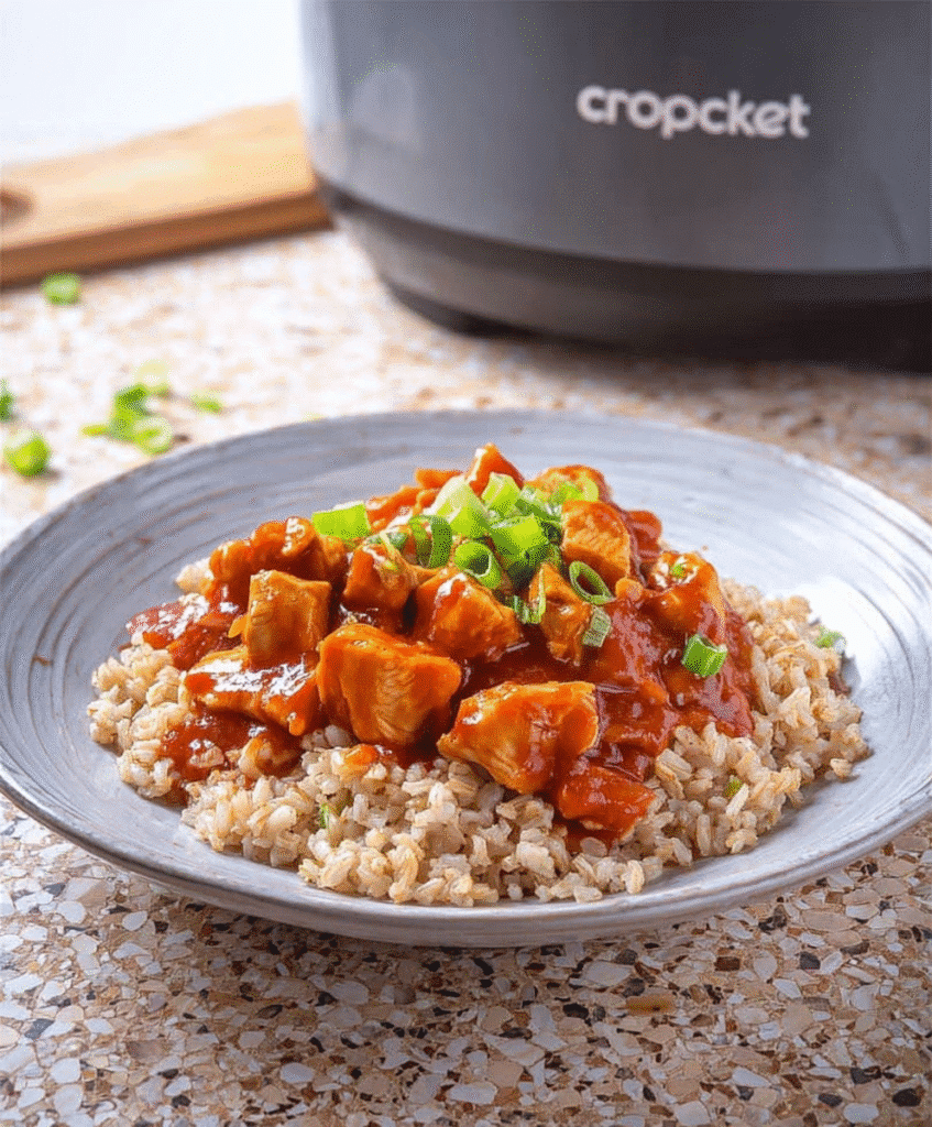 An appetizing bowl of Sweet Hawaiian Crock Pot Chicken with fluffy rice and green onions, with a Crock Pot in the blurred background.