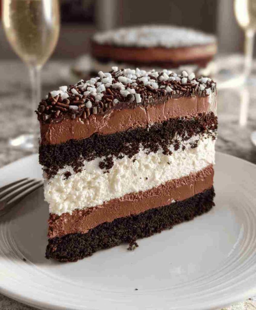 If you’re searching for a showstopping dessert that turns heads and melts hearts, this Tuxedo Cake recipe is exactly what you need. Imagine layers of tender, moist chocolate cake sandwiched between clouds of creamy white and dark chocolate mousse all crowned with a glossy chocolate ganache that drips dramatically down the sides. This dessert looks straight out of a high-end bakery but can be made easily at home with everyday ingredients.